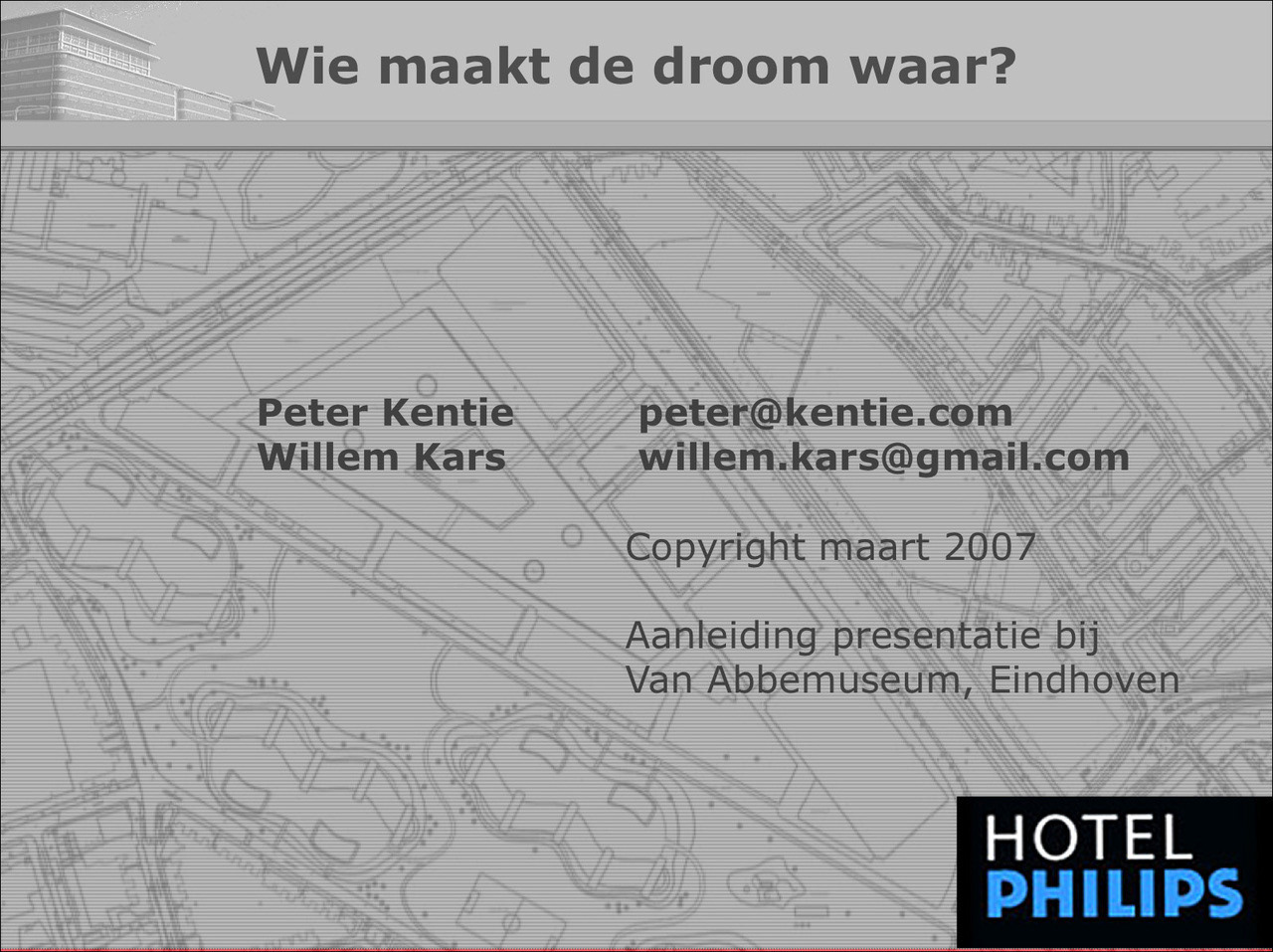 To promote the Strijp-S (re)development project in the city of Eindhoven the director the vanAbbemuseum, Charles Esche, invited 12 people to present their 'vision' in march 2007. Together with my friend Willem Kars we created a fictional hotel concept, aptly named Hotel Philips. The hotel experience design is based on the industrial heritage of Philips Electronics, the former owner and occupant op the Strijp-S area.